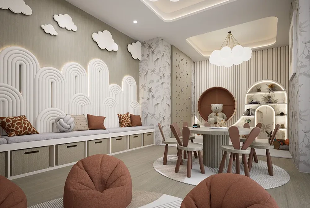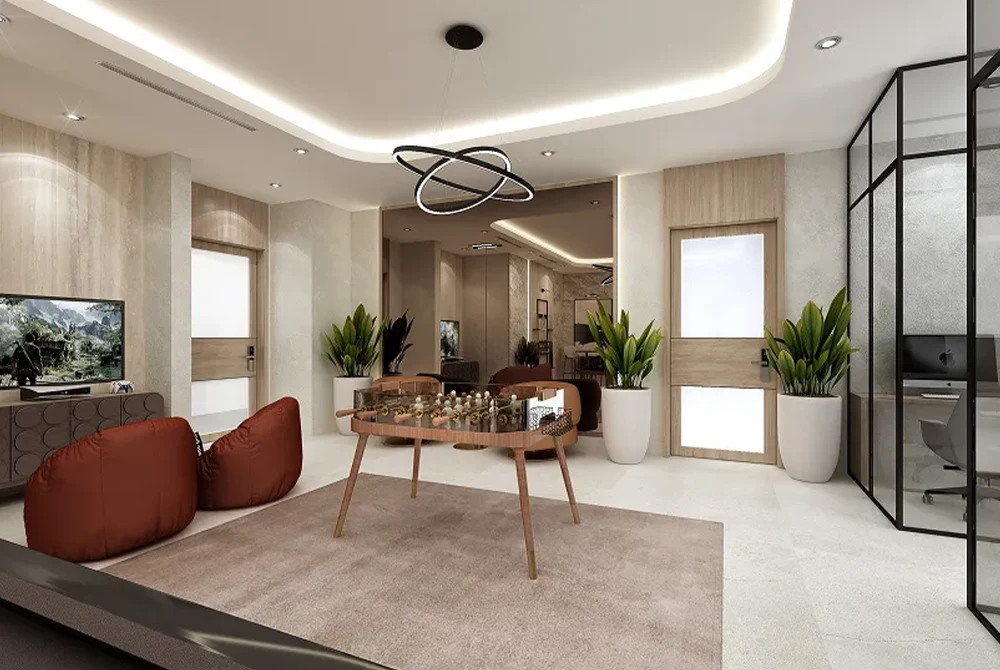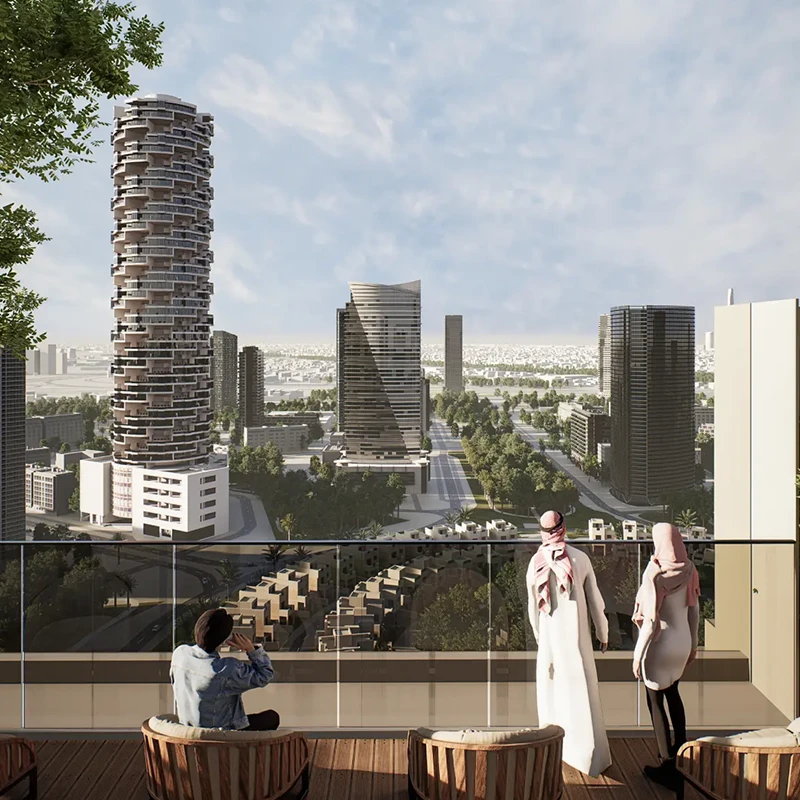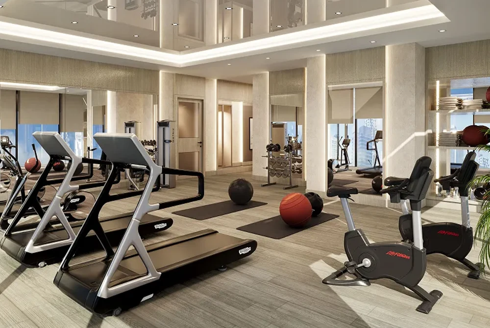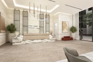 The contemporary architectural design draws inspiration from the rolling dunes of the Arabian desert, ensuring optimal views and practical living spaces throughout the building. Upon arrival, residents are welcomed by an expansive double-height entrance lobby, adorned with premium materials that instantly convey a sense of grandeur and sophistication.