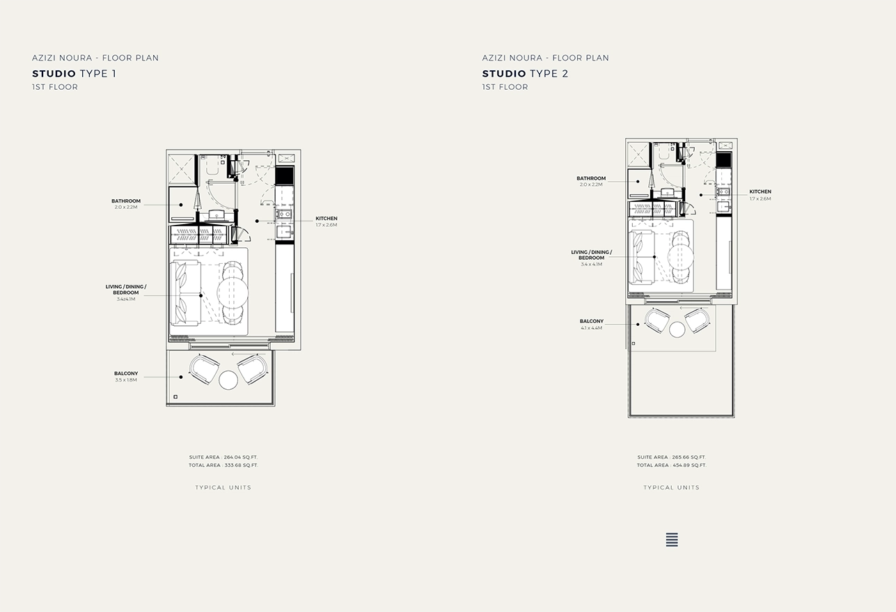 Azizi Noura floor plan features spacious studios, 1 & 2 bedroom apartments designed to harmonize with every lifestyle. Each unit is smartly designed to get maximum daylight & fresh air and achieve best possible space optimization. Inside the homes you will find modern fittings & fixtures, best specifications and white goods.