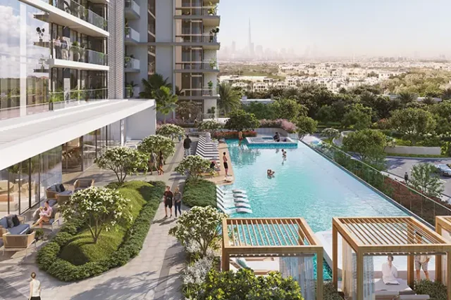 The building emphasises resort-style living, featuring amenities such as a grand lobby with floor-to-ceiling glazing, a landscaped pool deck, children’s play area, and indoor/outdoor fitness spaces—all set within the lush environment of Dubai Hills Estate, adjacent to the championship golf course.