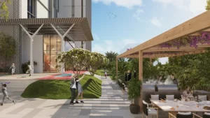 The building emphasises resort-style living, featuring amenities such as a grand lobby with floor-to-ceiling glazing, a landscaped pool deck, children’s play area, and indoor/outdoor fitness spaces—all set within the lush environment of Dubai Hills Estate, adjacent to the championship golf course.