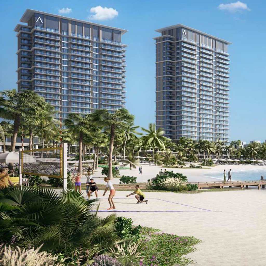 The project is located on Al Marjan Island, four man-made islands, offering panoramic sea views from its beachfront location. It is centered around community living, with landscaped gardens, recreational areas, retail stores, and outdoor dining spaces that bring residents together.