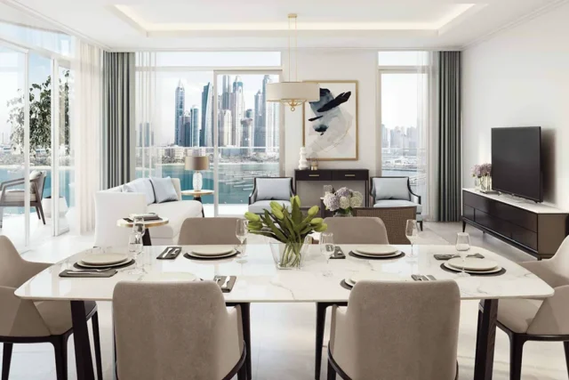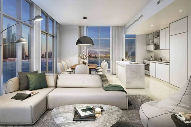 The residences are available in 1-, 2- and 3-bedroom configurations, with apartments spanning approximately 731 sq ft up to around 1,914 sq ft. The 1-bedroom units typically include a living & dining zone, open kitchen, one bathroom and a generous balcony (e.g., 66 m² suite plus ~12 m² balcony for some types). Larger 2- and 3-bedroom layouts add extra bedrooms, and may include a maid’s room or powder room, more expansive balconies and panoramic views. The layout emphasizes waterfront vistas, with many units oriented to maximise sea or marina views.