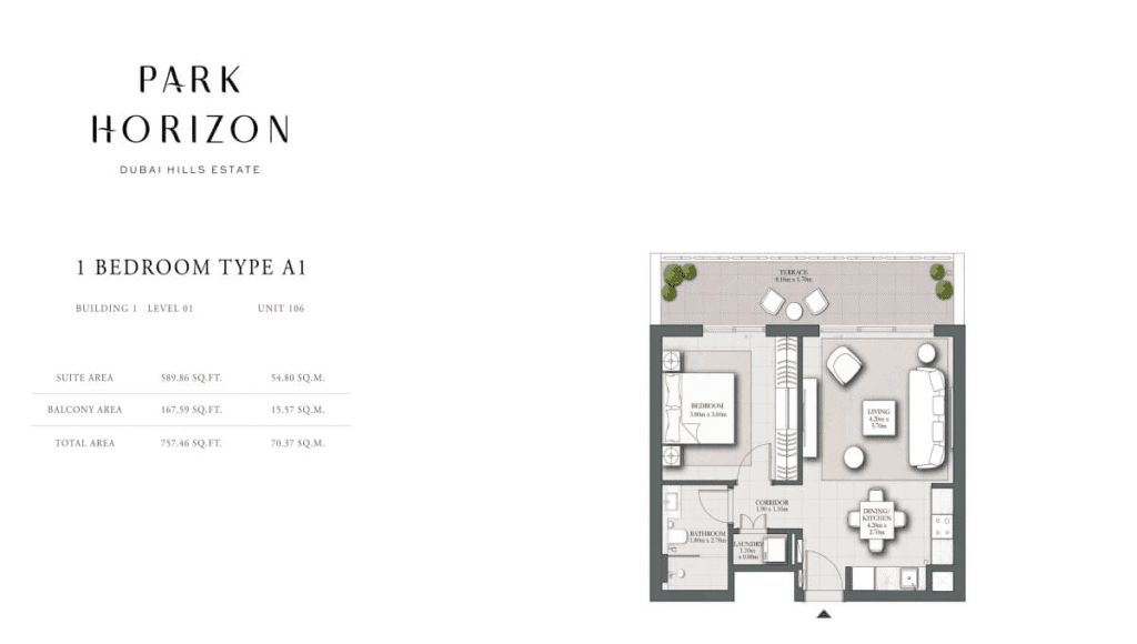Floor plan of Emaar Park Horizon offers a wide range of living options like 1, 2, and 3-bedroom apartments, as well as 2-bedroom duplex townhouses in different sizes and prices, every unit here comes with an ideal setting with modern fittings & fixtures, spacious rooms and ventilation, exploring the best lifestyle nestled in the heart of Dubai Hills Estate.