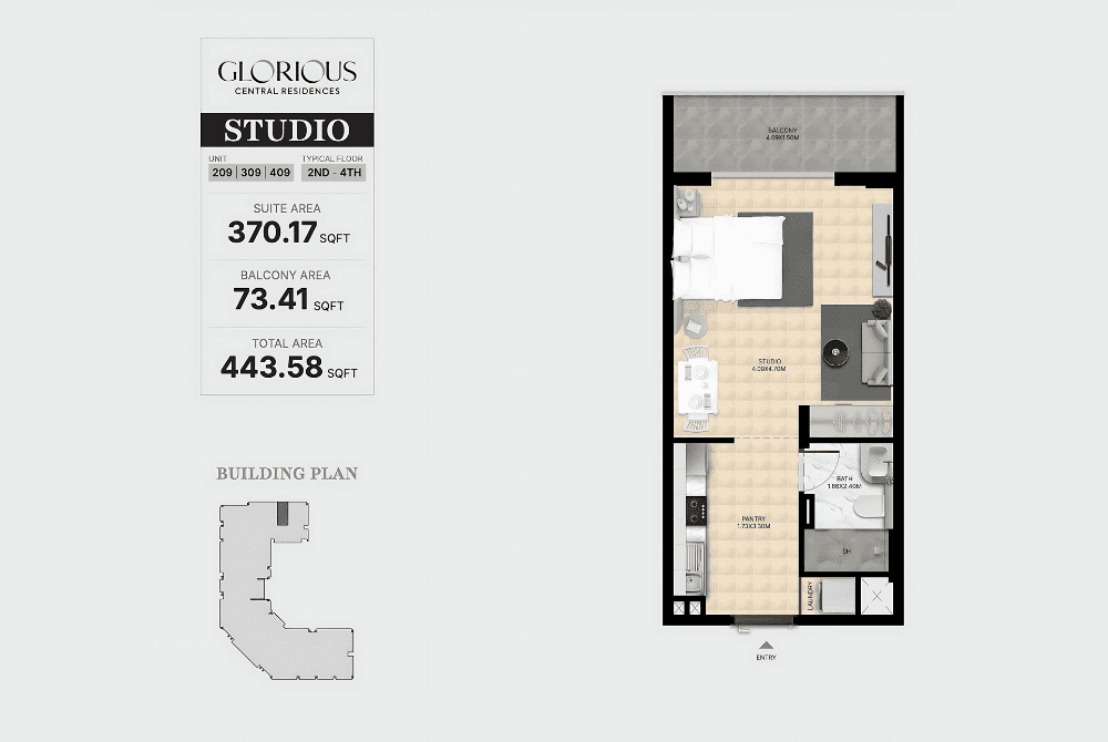 This luxurious complex has five levels of residences comprising studios, 1 & 2-bedroom apartments. The Glorious Central Residences floorplan boasts a spacious layout, modern design, and efficient use of space to ensure an optimum living standard.