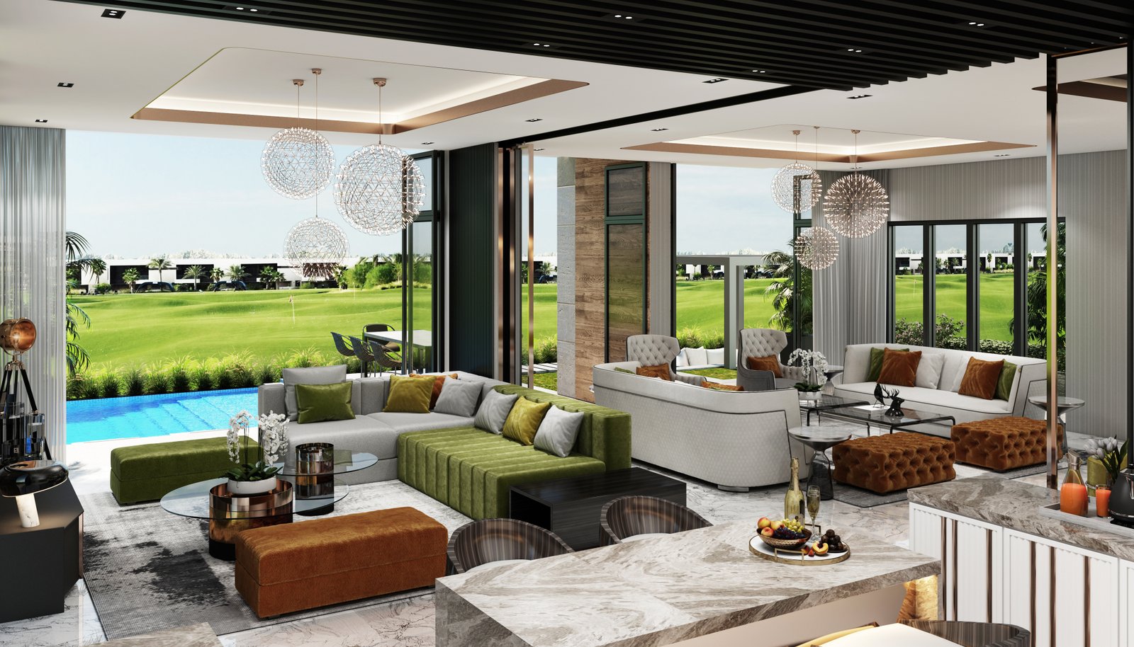From the grand double-height foyer, guests are welcomed into a world where natural light floods the living spaces through expansive glass walls. The thoughtfully curated layout includes generous living and dining zones and a designer kitchen—ideal for both large family gatherings and elegant entertainment.