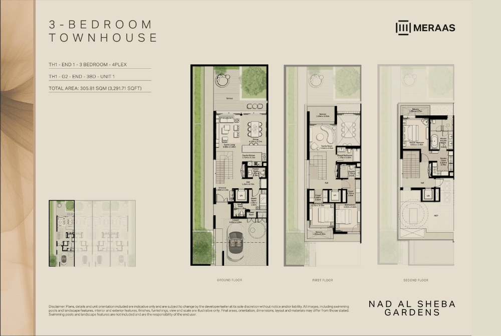 The floor plan of Nad Al Sheba Gardens 10 offers 3 bedroom townhouses and 4 to 7 bedroom villas. The homes boast large living areas, open kitchens, en suite bedrooms, and thoughtful add-ons like the maids’ quarters and private terraces. With multiple levels in the villas, privacy, comfort, and functionality are guaranteed. With magnificent bright interiors, double-height ceilings, and seamless flow from inside to the outdoors, these floor plans are yet another consideration for present-day family life along with entertaining with ease.