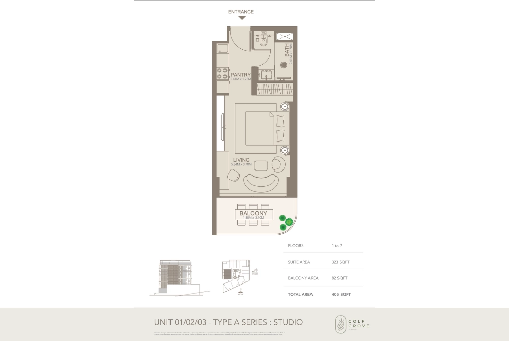 Regent Golf Grove offers studio, 1 bed apartments & 1 bed garden suites and this property type comes in different price ranges. You can buy a studio with a starting price of AED 0.5 million, 1 bed apartments with starting price of AED 0.9 million and a 1 bed garden suites with starting price of AED 1.04 million.