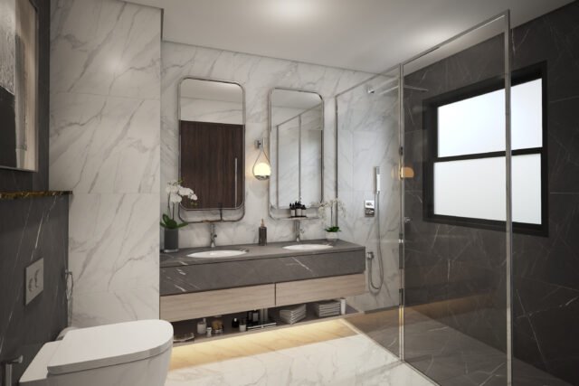 - Modern, minimalist facades with large glass windows, high ceilings, premium finishes, private gardens and terraces